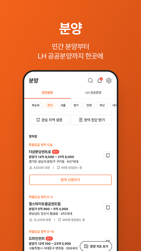 Controlla i calendari delle vendite di appartamenti a livello nazionale e gli annunci di abbonamento, tutto in una volta su Zigbang.
