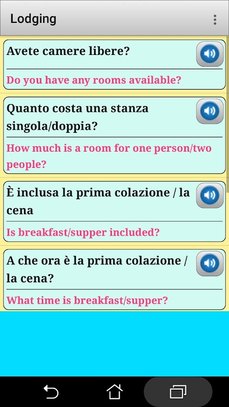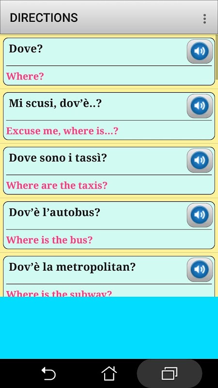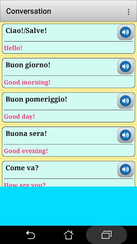 Collection of free Italian phrasebook That help you to learn the Italian language and communicate with Italian people ,You can hear and learn them, You find more topics like : Italian greetings , customs , transportation , directions , accommodation , communication , dinner , in the city , shopping , activities , colors and the questions.