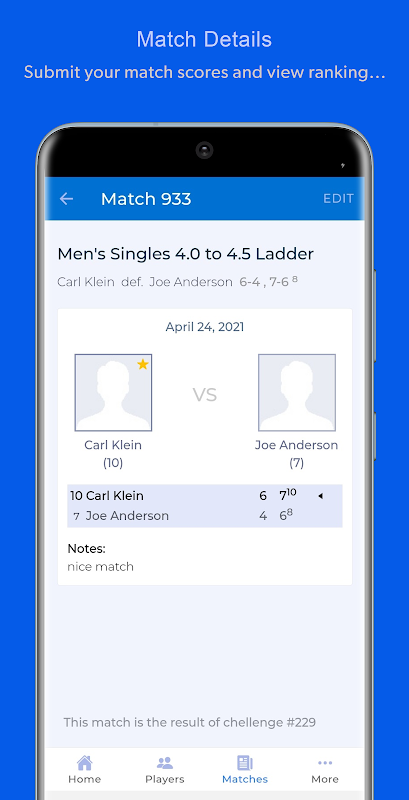 Schedule and play tennis ladder matches, report scores, view results and stats.