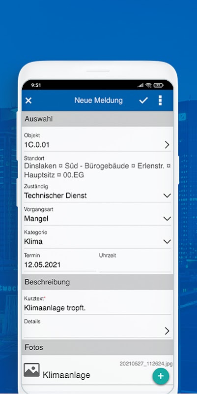 The App Maintenance communicates with your iTWO fm server via WebService and is able to process maintenance, maintenance management or fault messages, record working times, confirm work orders, forward processes, record photos and much more.