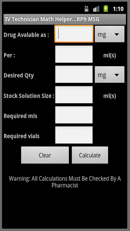 Just a simple program to calculate milliliters required from a stock of mcg, mg or grams per milliliter