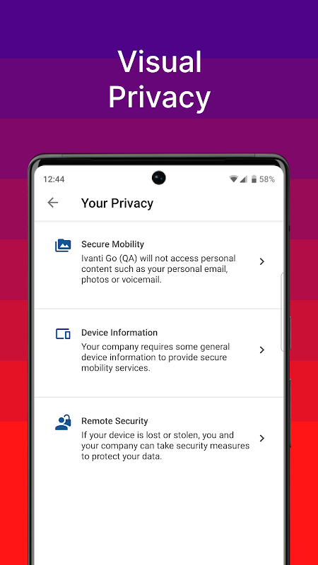 Ivanti Go securely connects your Android device to your company network so that you can easily access email and other work resources.