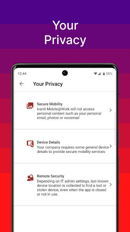 Note: Mobile@Work works in conjunction with Ivanti Core deployed by your company’s IT organization. Please follow the instructions from your IT organization to use this app. Mobile@Work is required to access corporate resources and therefore should not be removed without first consulting your IT organization. Visual Privacy allows your organization to see device details such as model name, OS version, roaming status, and company apps. However, IT cannot see personal information such as personal email, personal contacts, photos, videos and voicemail.