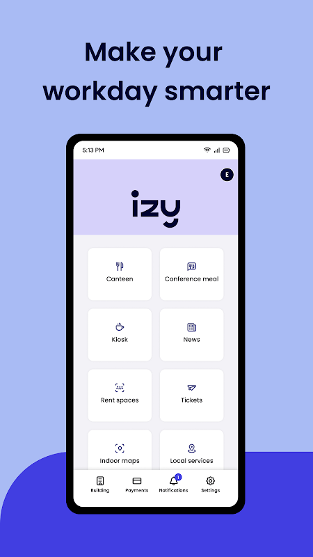 Izy app is a new ecosystem related to facility services and management. The workplace of tomorrow will be fully digitalized. All basic services will be available in the app and make our workdays easier. Izy app is available for all tenants and their employees as well as for all visitors of the building. Users get an invitation to register in the app for tenant-specific deals. Visitors can use the app without registration.