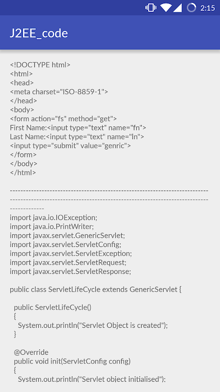 The Application has been developed to emphasis on the basic codes of JDBC and Servlet. This Application consists of two modules such as JDBC and Servlet. Each modules includes various sub modules which comprise of admirable codes like ServletLifeCycle Code, Servlet Chaining, Insertion with interface (statement,prepared,callable), Updation with interface (statement,prepared,callable), Deletion with interface (statement,prepared,callable) and Fetching with interface (statement,prepared,callable) , etc.