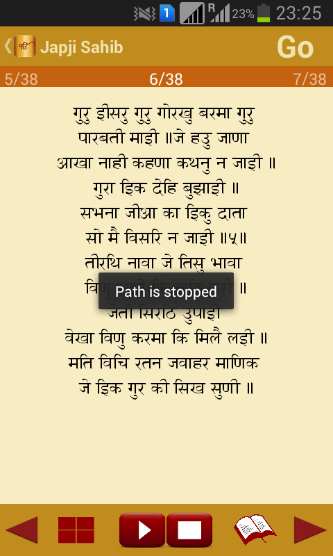'Japji Sahib Path' app let you read and listen to 'Japji Sahib Audio' on your mobile. You can read 'Japji Sahib Path' in Hindi or Punjabi and can read meaning of path while reading or listening to 'Japji Sahib Audio'. Purpose of this app is to let busy and mobile young generation reconnect with Sikhism and Gurubani by reading path on mobile. We hope that you will find this app useful and and will use it daily.