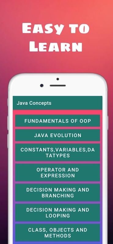 Learn Java programming. This App is help to school or college students for learning and developing the Java programming Concepts. Java is among the most popular programming languages.