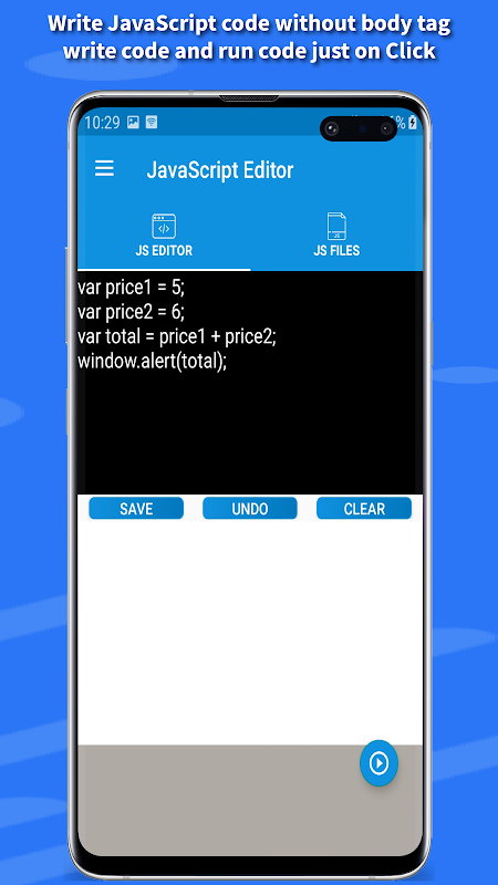 JavaScript editor and Viewer used to run JS code. The app is mainly used for learning purpose. Everyone can use the app on the go from your android device. The output will be given using alert dialog. The errors in the code is shown in the console in the bottom of the screen.