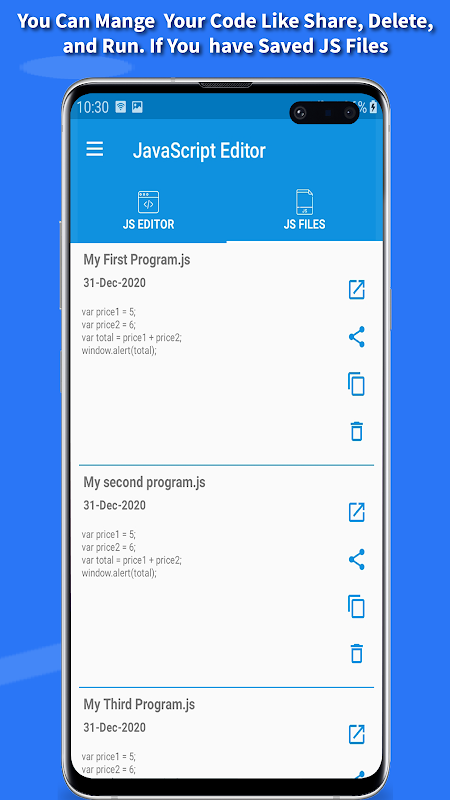Welcome to JavaScript editor & Viewer app for learning java script code very easily. The app is offline and doesn’t need any network connection to run the code. The app is specially created for the purpose of learning java script without using computer system. JavaScript editor/IDE is specially offered for those who doesn’t have laptop/desktop computer system. The app could easily be used to run your JS code.