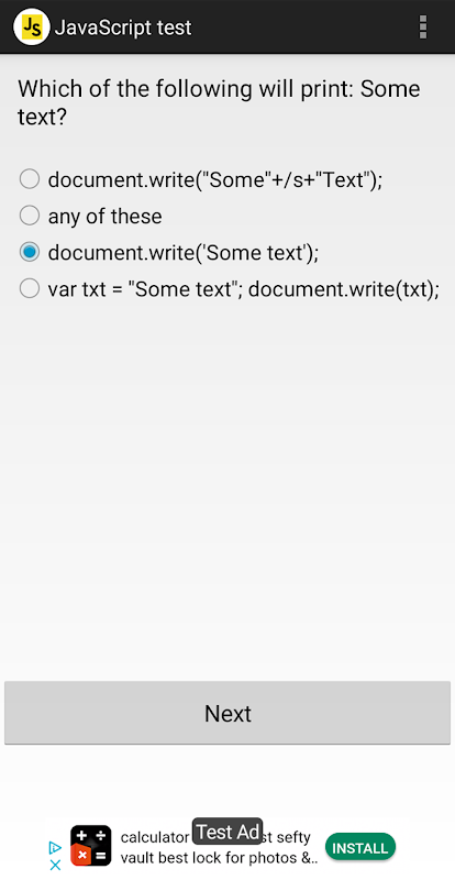 JavaScript programming test. 212 questions in total, 20 randomly selected.