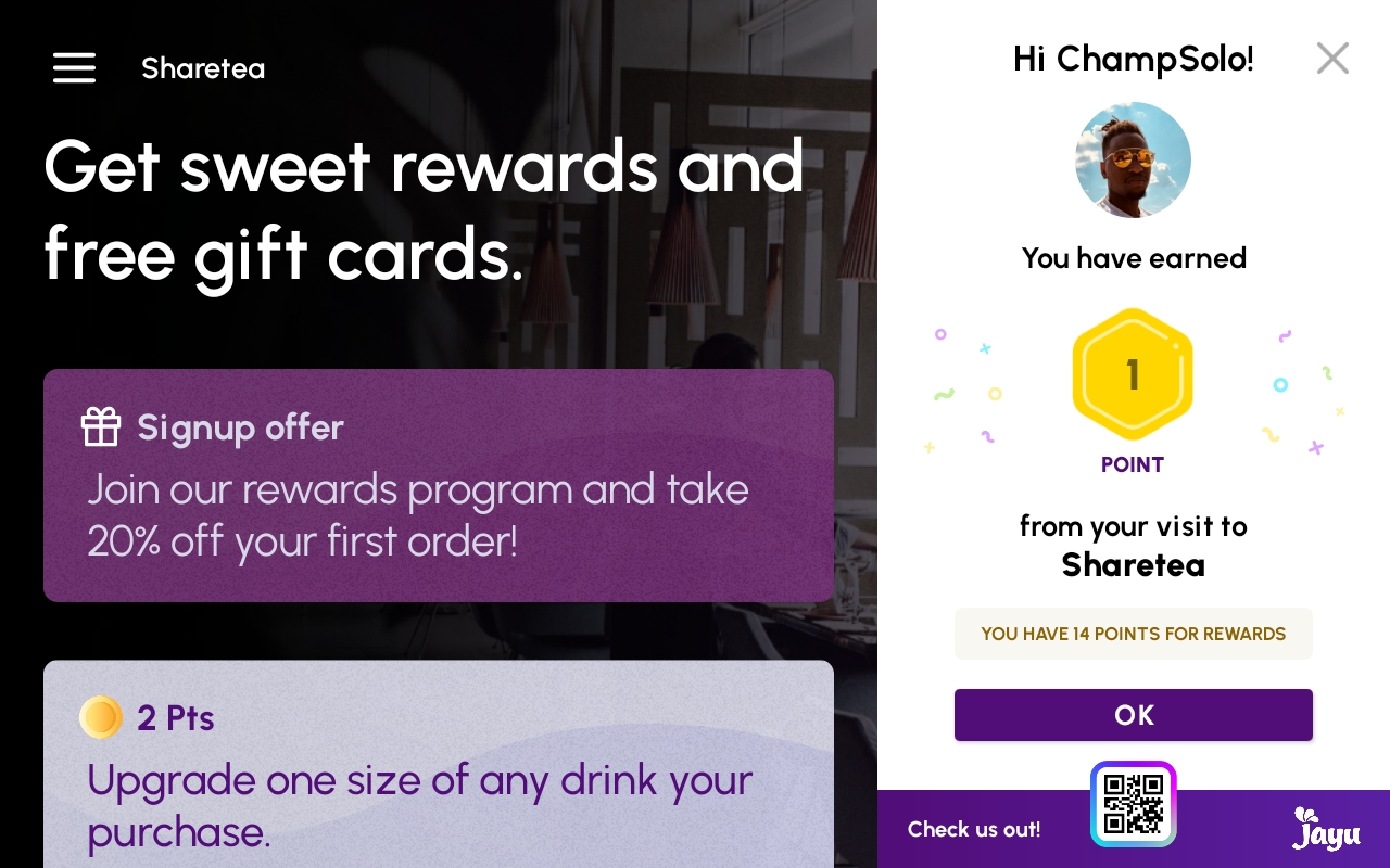 Use the Jayu tablet app to easily give customers reward points. Setup near the point of sale to encourage your customers to join your loyalty program.