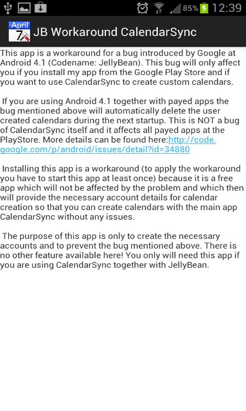 The purpose of this app is only to create the necessary accounts and to prevent the bug mentioned above. There is no other feature available here! You only will need this app if you are using CalendarSync together with JellyBean.