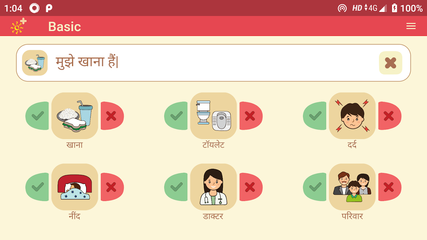 This application is organized into three levels - Basic, Intermediate and Advanced. In the basic level the user can communicate by using 6 icons with 12 predefined expressive sentences which cater to the immediate needs of the patient (like Stroke & Aphasia patients) while staying in hospital.The intermediate level provides 18 icons with 36 predefined expressive sentences that can use by patient (like Stroke & Aphasia patients) during their recovery at home.Moreover, this application allows single touch communication which makes it easier to bridge the communication gap between the patient and their caregiver, as the patient can convey their needs efficiently.