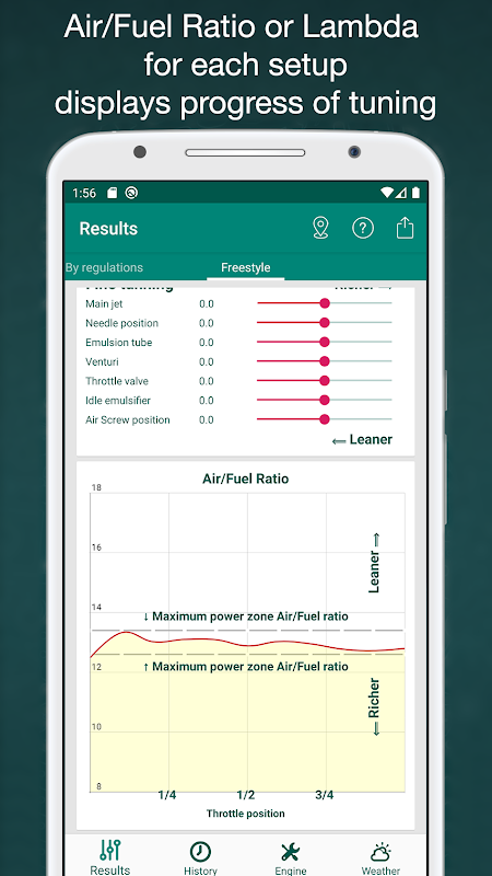 • History: This tab contains the history of all jetting setups. If you change the weather, or engine setup, or fine tuning, the new setup will be saved in history.