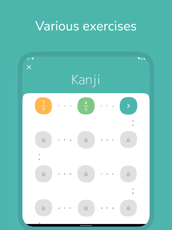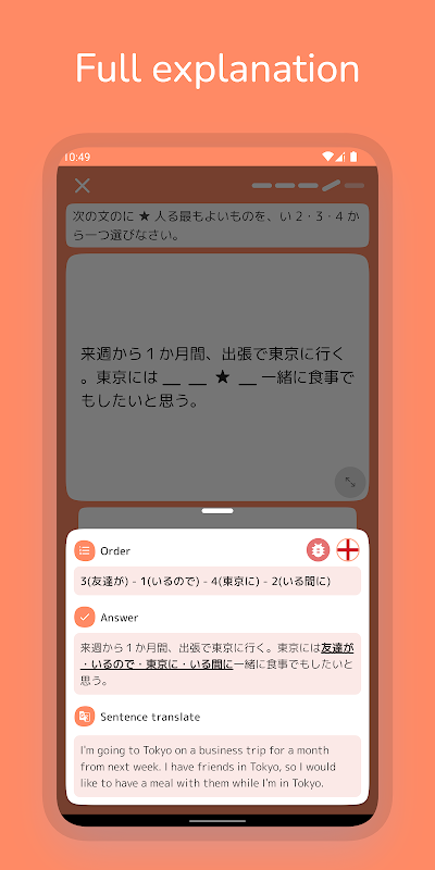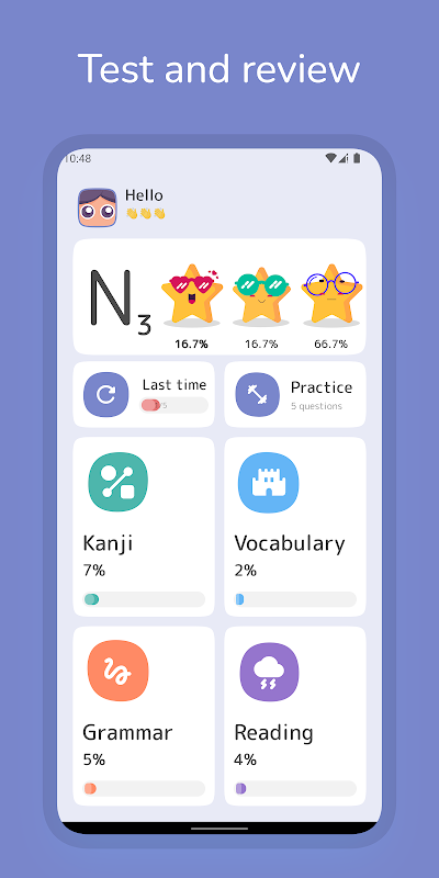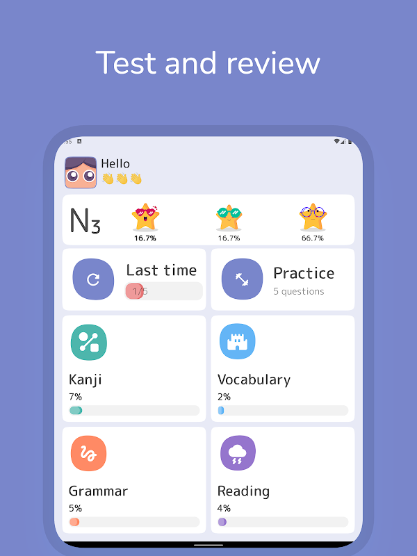 👍 Intuitive, easy to use interface: displays the results, the number of correct answers, making it easy for you to grasp your JLPT practice.