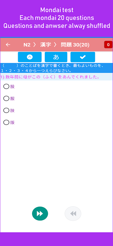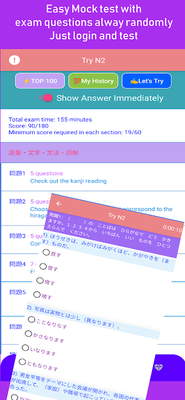- The number of exam questions is rich with more than 3000 exam questions, each subject from 20 to 30 questions. Words, kanji, grammar, reading comprehension, star search (*).