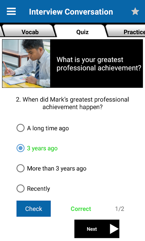 It is difficult to practice speaking English on your own. It is also difficult to prepare for a job interview in English and learn business English. But with this app, you can do all three!