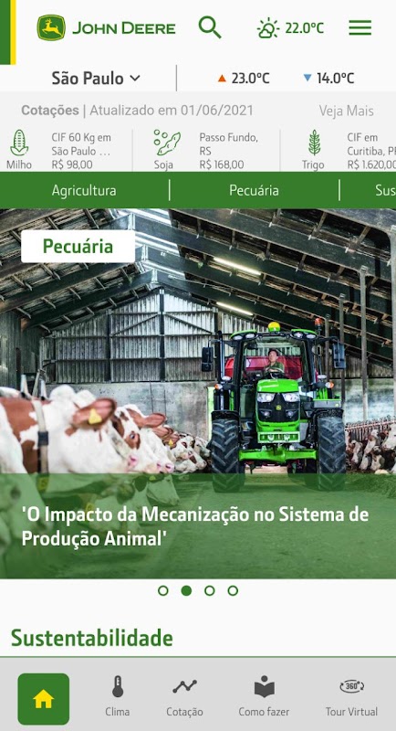 The new version of John Deere Conecta brings a platform with much more relevant content for the Brazilian rural producer. Daily information on weather forecasts, commodity prices, training and more.
