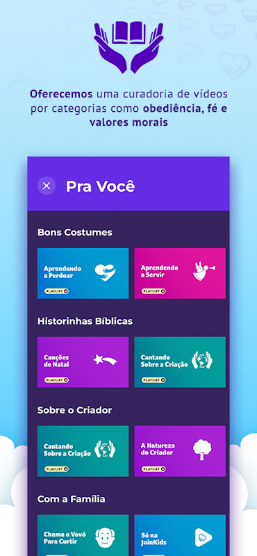 We were born with the purpose of connecting the hearts of the little ones to the heart of God and, thus, helping families that invest in an education guided by biblical principles. We are unhappy with the various applications that corrupt children's minds through inappropriate concepts and immoral images. That's why we go against this culture, preserving their innocence and purity through content based on Christian values, in a totally safe and ad-free environment. Our platform has copyrighted and licensed content such as Turma do Cristãozinho, 3 Palavrinhas, Minha Vida é Uma Viagem, Turminha Querubim, Banda Krozz, Children Before the Throne, Rebeca Nemer, Pequenos Atos, Turma do Biguinha and many others to brighten and edify the your children. And even without internet, your family can access our videos on computers, tablets and cell phones, keeping children on the path they should walk on at all times. This is our mission: to encourage children to seek the Lord and help families in the formation of their character, based on the Rock that is Christ. Sign one of our plans and let's go together, with love and joy, to show the little ones that the Kingdom of God is theirs.