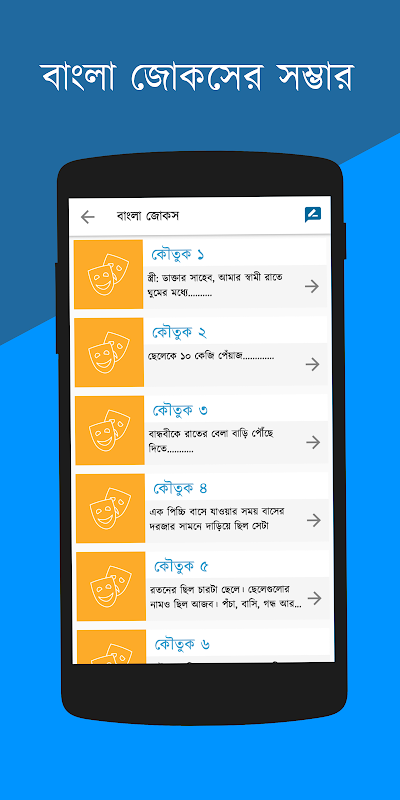 We have added many selected bangla jokes collection to this application. We hope that Jokes 101+ Bangla application gives you unlimited entertainment. We have collected gopal var mojar jokes funny and mature (adult) WhatsApp jokes, boltu jokes, jamai bou jokes, student teacher jokes and more jocks are adding day by day so stay connected with us for lifetime fun. You can copy the jokes form this application and share on WhatsApp, IMO, Facebook, Instagram, twitter and other social networks.