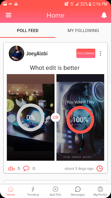 * Create polls quickly and easily by capturing 2 pics.
