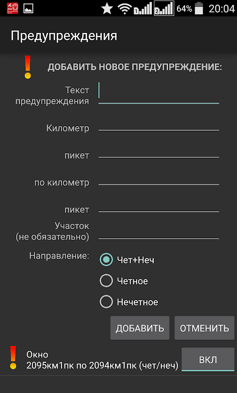 2. Ввод предупреждений, мест опробования тормозов, обрывных километров;