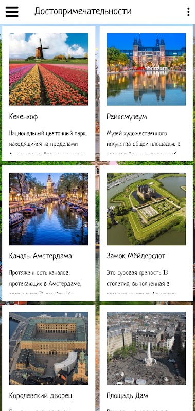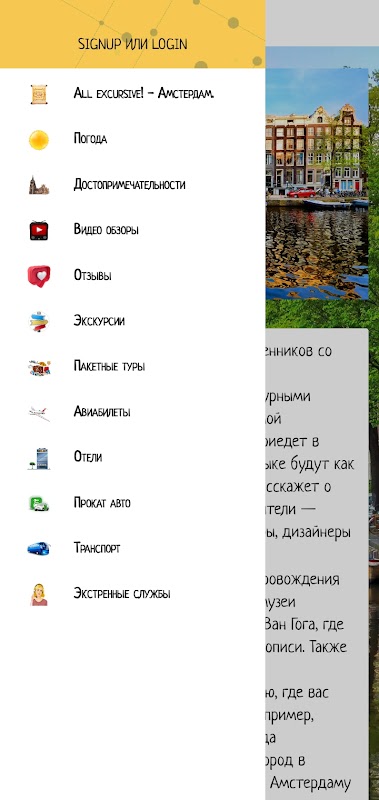 アプリケーションでは、アムステルダムとの最初の知り合いを作り、観光スポットやビデオレビューを見て旅行する場所を選択することができます。このアプリケーションには、アムステルダムでサービスを提供しているツアー代理店やホテルに関する情報も含まれています。