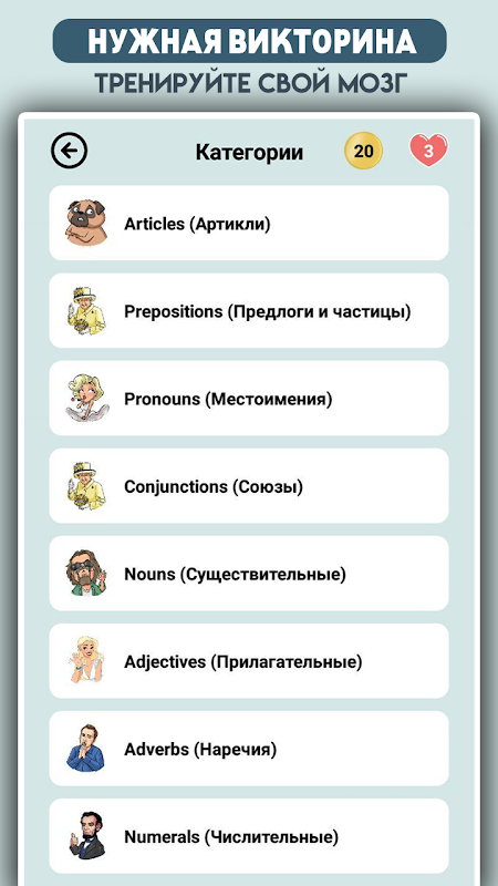 アプリケーション英語-クイズをインストールします。テスト。文法は、質問に答え、正しい答えを推測し、新しい知識を得て、記憶を訓練する必要がある面白いゲームです!
