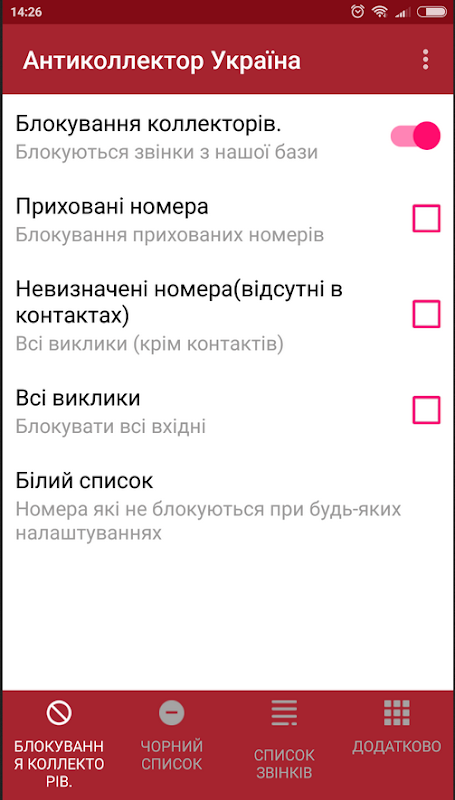 В додатку є чорний список, білий список, власна база номерів з постійним оновленням, блокування невизначених звінків (Скайп і інші).
