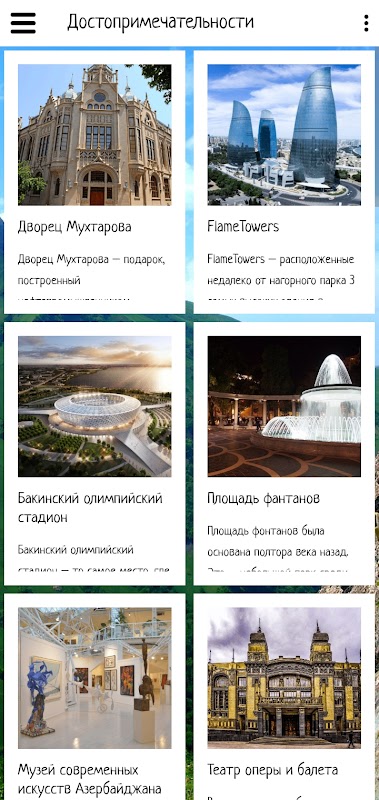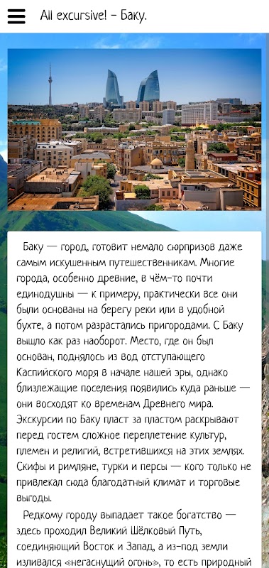 このアプリケーションでは、バクーとの最初の知り合いを作り、観光スポットやビデオレビューを見て旅行する場所を選択することができます。また、アプリケーションには、バクーでサービスを提供している遠足局やホテルに関する情報があります。