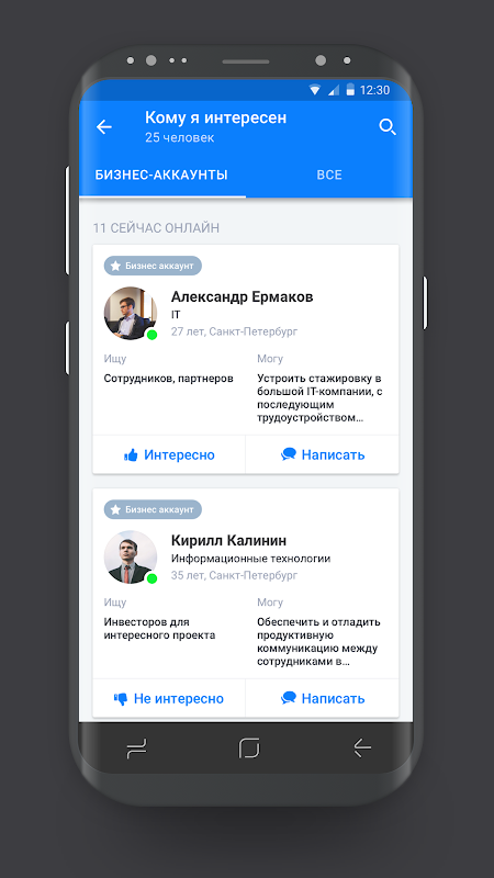В профиле каждого пользователя — описание его бизнеса, уровень дохода, полезные навыки и запрос на поиск человека или услуги. Знакомьтесь с теми, кому вы нужны прямо сейчас.