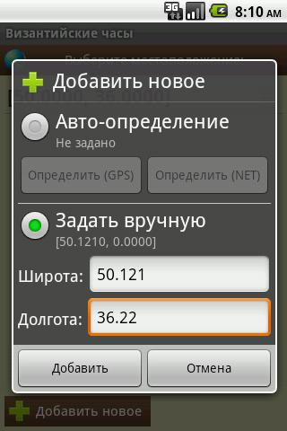 Программа позволяет определять текущее византийское время в выбранной точке земного шара. Византийское время, использовавшееся в древней Византийской империи, является солнечным временем. Сутки начинаются с ночной части суток одновременно с заходом солнца. После восхода солнца начинается дневная часть суток. Таким образом, продолжительность дня и ночи разная (кроме двух дней в году). Также вполне естественно, что солнечное время в разных точках земного шара будет различаться.