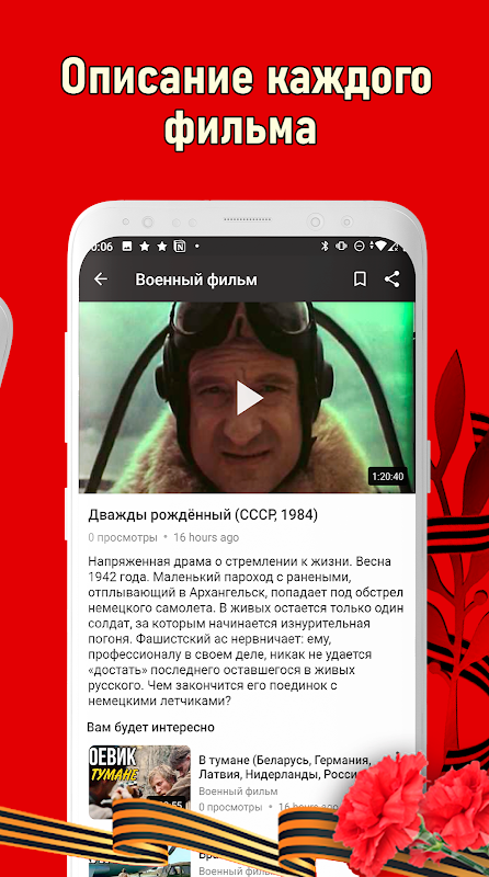 「戦争シネマ」アプリケーションは、戦争、ドキュメンタリー、プログラムに関する長編映画を含むオンラインシネマです。つまり、カタログの中から、軍事的偏見のあるコメディ映画、戦争に関する強力な映画、さまざまな戦争期間とさまざまな戦争に関するドキュメンタリー、アクション映画など、さまざまなカテゴリの映画やシリーズを見つけることができます。 。第二次世界大戦に関するソビエト映画があり、ソビエト人の偉業の歴史を最もよく伝えています。