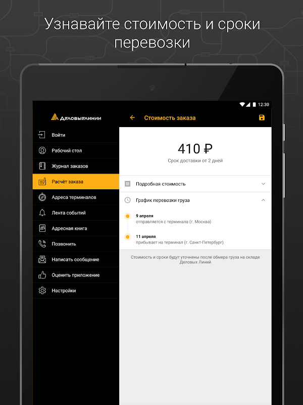 Business Lines モバイル アプリケーションは、大手運送会社の主要サービスに簡単にアクセスできます。ロシアと関税同盟加盟国間の配送を管理するための便利な貨物サービス。小さな商品から、さまざまなサイズの大きな商品まで、輸送サービスを注文できます。