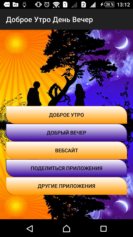 Приложение Доброе Утро День Вечер это сборник открыток ДОБРОЕ УТРО и ДОБРОЙ НОЧИ и ДОБРЫЙ ВЕЧЕР! В нем собрано около +1000 открыток-поздравлений-пожеланий. Что может быть лучше, чем теплое пожелание доброго утра или доброй ночи от близких вам людей? На самом деле, столь обычные, на первый взгляд слова, как ДОБРОЕ УТРО/НОЧИ способны вызвать самые трепетные чувства, а если дорогой сердцу человек находиться не рядом с вами, то отправьте ему красивую открытку и тем самым поднимете настроение своему избраннику, другу, родственнику. Скачайте наше приложение и удивляйте близких вам людей, обеспечивая им позитивное начало нового дня или приятную улыбку перед сном. В нашей галерее картинок С добрым утром, ДОБРОЙ НОЧИ, ДОБРЫЙ ВЕЧЕР большой выбор прекрасных открыток. Делимся ими через Социальная Сеть. и не забываем оценивать на 5.