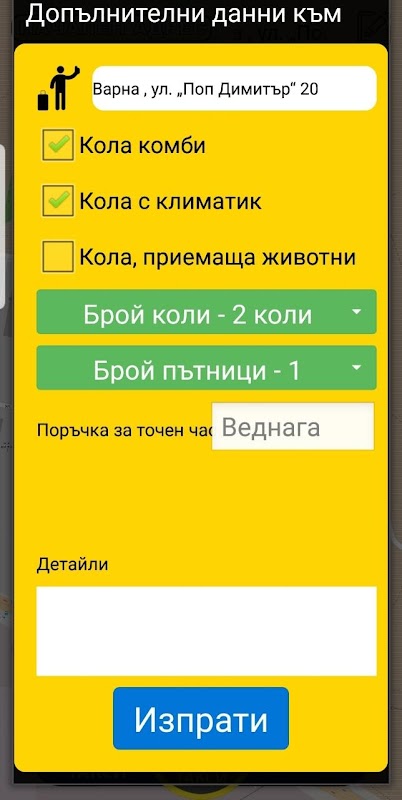 あなたは2ボタンのタクシーを注文するだけです!あなたの注文は私たちのディスパッチャによって受け入れられ処理されます、そしてあなたはあなたの税が何であるか、それがコインのどこにあるか、それがあなたとどのくらいの期間続くか、そしてそれがどのようにあなたに来るかを見ます。ご注文の際には、次のようなさまざまな要件を選択できます。車が未舗装の道路を走行し、荷物を運び、荷物室または荷車を持っており、その他多数の荷物を持っている。あなたはリアルタイムで私達のチャットシステムを通して私達のディスパッチャーに直接書くこともできます。
