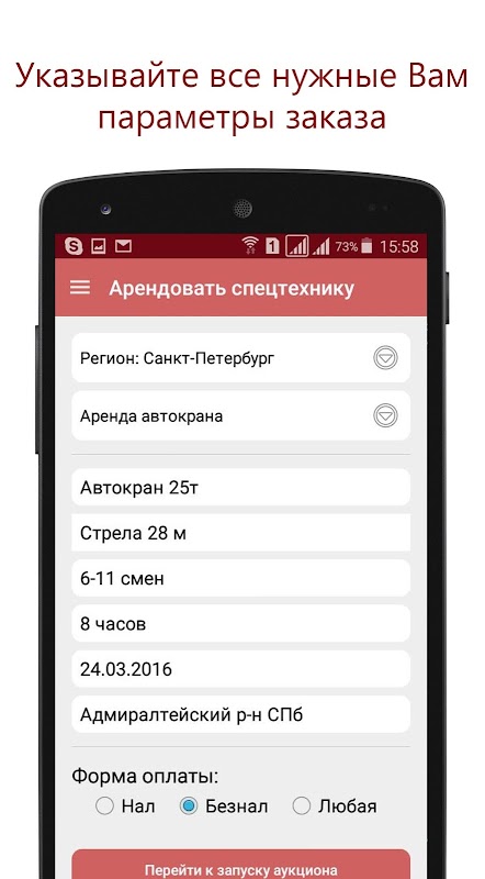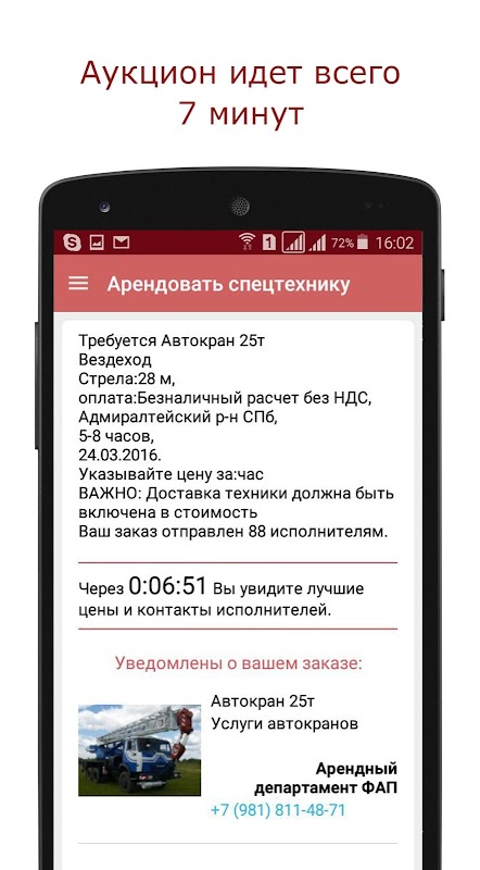 Сервис позволяет запускать аукцион в любое удобное время. Владельцы техники получают ваш заказ в течение 1 минуты и уже через 7 минут вы получаете лучшие цены на аренду нужной вам спецтехники в своем городе, а также телефоны исполнителей, готовых выполнить работу.
