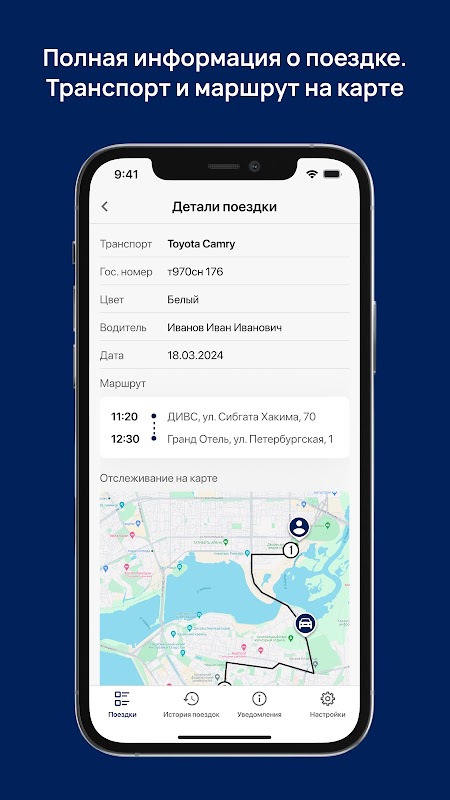 簡単な 2 ステップで、迅速かつ便利な方法で輸送を注文できます。現在の旅行と交通機関のリクエストのリスト。旅行に関する完全な情報。地図上の交通手段とルート。任意の期間の旅行の履歴。ニュースや交通機関の予約に関する通知
