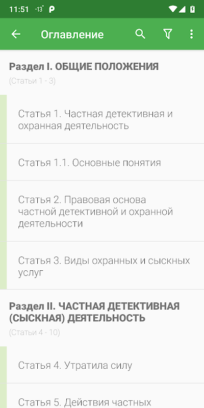 このアプリケーションは、「私立探偵およびセキュリティ活動に関する」法律の便利なガイドです。申請書には、現時点で関連する法律の全文が含まれています。