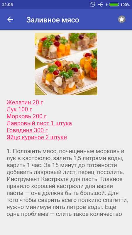 Заливное — праздничное русское национальное блюдо из залитых студенистым наваром мяса, птицы или рыбы. В отличие от холодца в приготовлении заливного обязательно использование желатина, а главное условие подачи — красота. Готовое блюдо должно быть прозрачным и чистым: ингредиенты в нем должны казаться застывшими в стекле. Залить можно все что угодно. Традиционно — говядину или свинину, но их вполне можно заменить на курицу, рыбу или морепродукты. С ними заливное выглядит на столе особенно эстетично. Нередко на праздники так подают говяжий язык. Чтобы заливное в домашних условиях стало настоящим произведением искусства, все продукты выбирают свежие, тогда бульон получается насыщенным и прозрачным. Для придания ему красивого оттенка используйте травы, специи, цветные овощи, грибы и овощные соки. Перед тем как залить мясо, готовый бульон процеживают, добавляют желатин и доводят почти до кипения, но ни в коем случае не кипятят. Особенно выигрышно выглядит заливное с кусочками цветных овощей, яиц и ярких ягод, например клюквы или брусники.