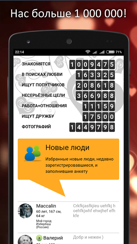Многие задаются вопросом – Как найти себе девушку (парня)? Скромных людей очень много и не каждый решится подойти к человеку, который понравился. На помощь таким людям и приходит сайт знакомств и наше приложение. Каждый сможет проявить себя онлайн, ведь это гораздо проще. Страха первого разговора больше нет!