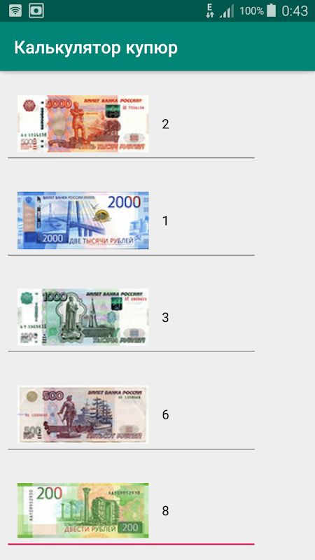 電卓はあなたが金銭登録機で、または金庫で、あるいは時間を節約することで他の同様のニーズでお金を数えるのを助けます。アプリケーションはロシアの通貨(ルーブル)を含みました。