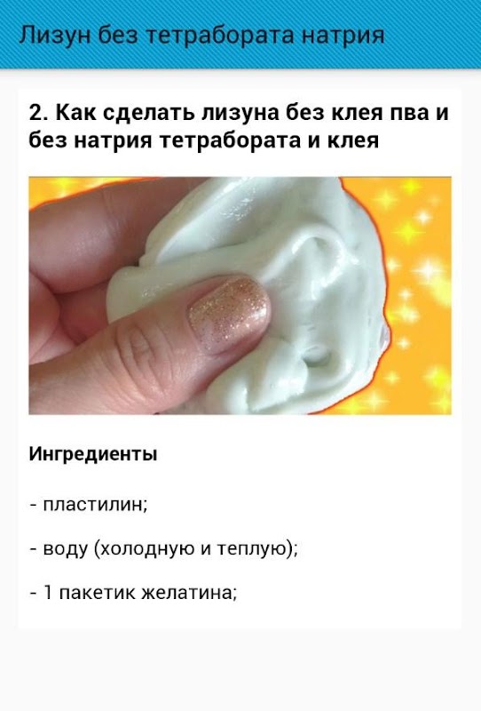 - Как сделать лизуна без клея пва и без натрия тетрабората и клея