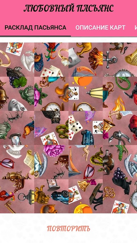 Сформулируйте вопрос и нажмите кнопку "НАЧАТЬ РАСКЛАД". Карты автоматически перемешаются и начнется расклад слева направо. Всего получится 5 рядов по 4 карты в каждом. Внимательно посмотрите, где могут совпасть рисунки, что-то совпадет сразу, что-то нужно поискать. Каждую карту можно поворачивать по часовой стрелке (НАЖАВ НА НЕЕ), чтобы совпал нужный рисунок. Карты нельзя перекладывать.
