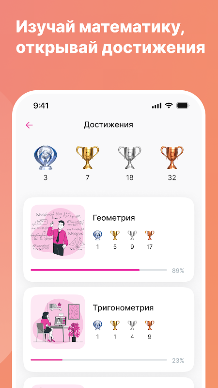 このアプリケーションは、数学の統一州試験の準備に最適です。理論全体は、幾何学、三角法、オリンピックの問題、パラメータの問題などのトピックとセクションに分かれています。各テキストと記事は、知識をテストして定着させるための演習、つまり課題とテストによって補足されています。