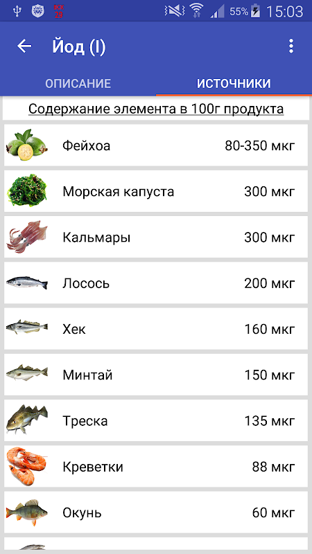 • Подробный список продуктов, содержащих данный элемент;