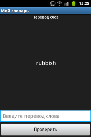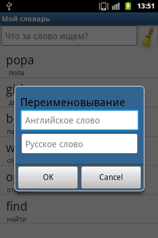 Для того что бы добавить слово - проведите пальцем в влево, что бы перейти к списку слов - проведите пальцем вправо.