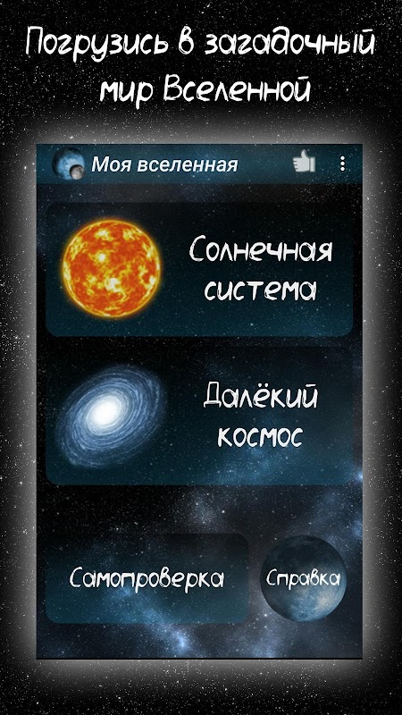 Моя вселенная - это приложение, которое в любое время, в любом месте может помочь вам познать всю красоту и масштабность космоса..От нашей с вами Солнечной системы до самого глубокого космоса. Изучив весь материал, вы будете знать большинство основных понятий встречающихся в космологии и астрономии, также вы сможете пройти тесты, которые покажут насколько вы овладели знаниями материала и откроют вам новые интересные подразделы.