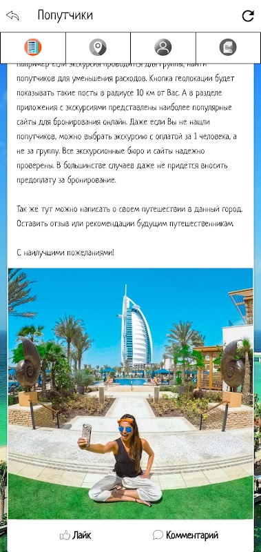 一人旅やカップル旅行でおもしろい遠足をしたい場合もありますが、ガイドが団体費を請求するので高額です。このアプリケーションでは、共同ツアーの仲間の旅行者を見つけて、ツアーのコストを削減できます。アプリケーションの「仲間の旅行者」セクションで投稿を公開すると、半径10km以内のアプリケーションの他のユーザーに表示されます。そして、「ジオロケーション」アイコンをクリックすると、半径10km以内に他のそのようなオファーが表示されます。さらに、アプリケーションでは、ドバイ、シャルジャ、アブダビの都市との最初の知り合いを作り、観光スポットやビデオレビューを見て旅行する場所を選択することができます。このアプリケーションには、選択した都市でサービスを提供している旅行代理店、旅行代理店、ホテルに関する情報も含まれています。