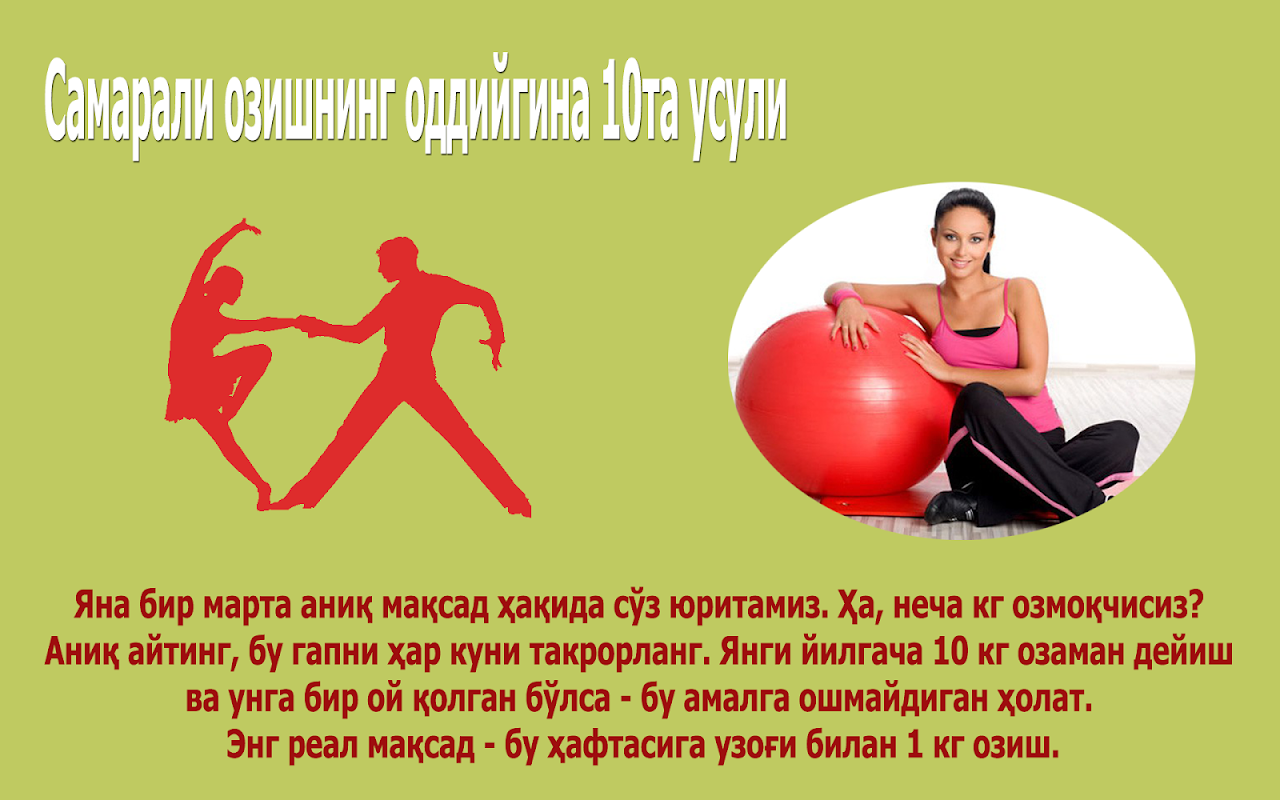 賢く減量。サマライozishning 10ta oddy usuli。 Ozish、parҳez、フィットネス